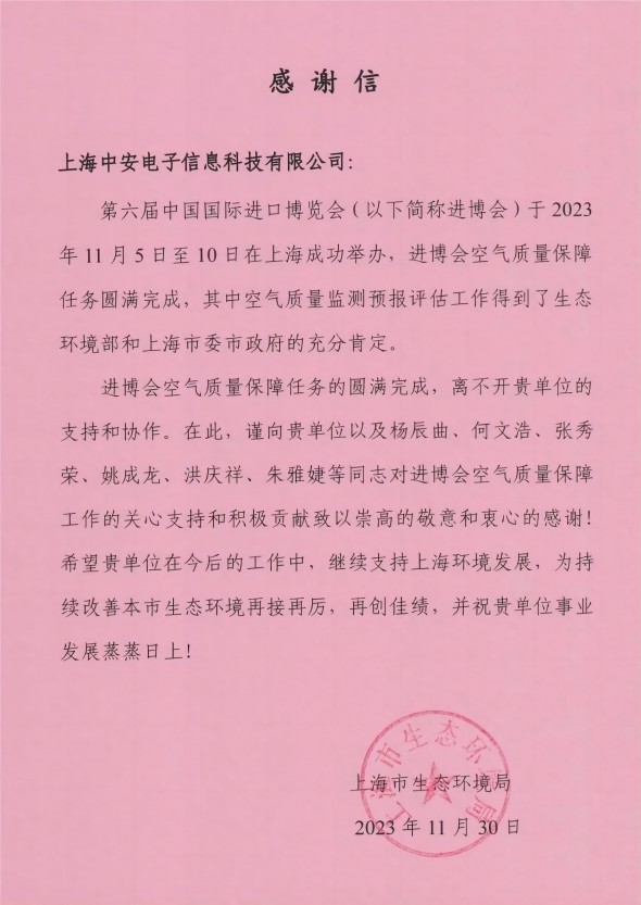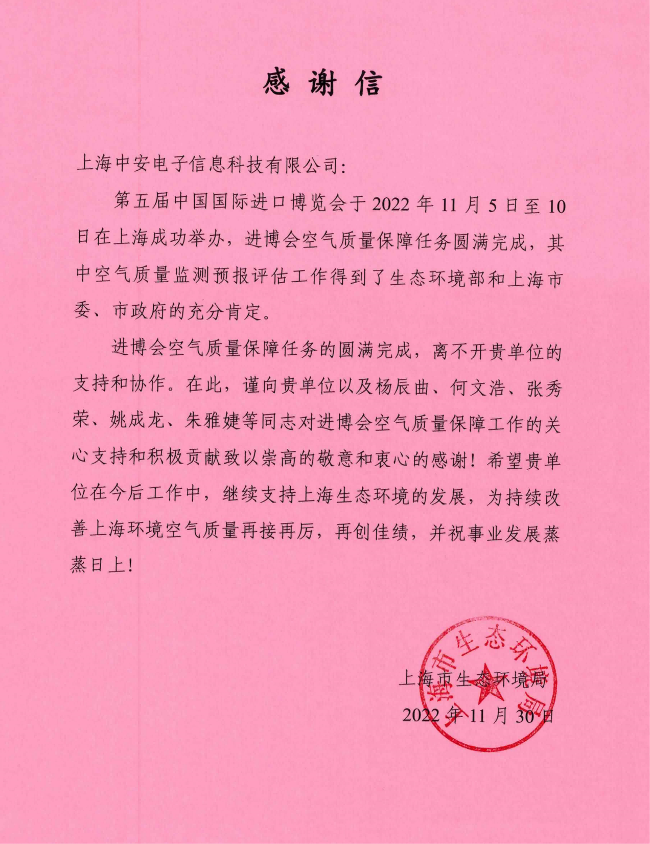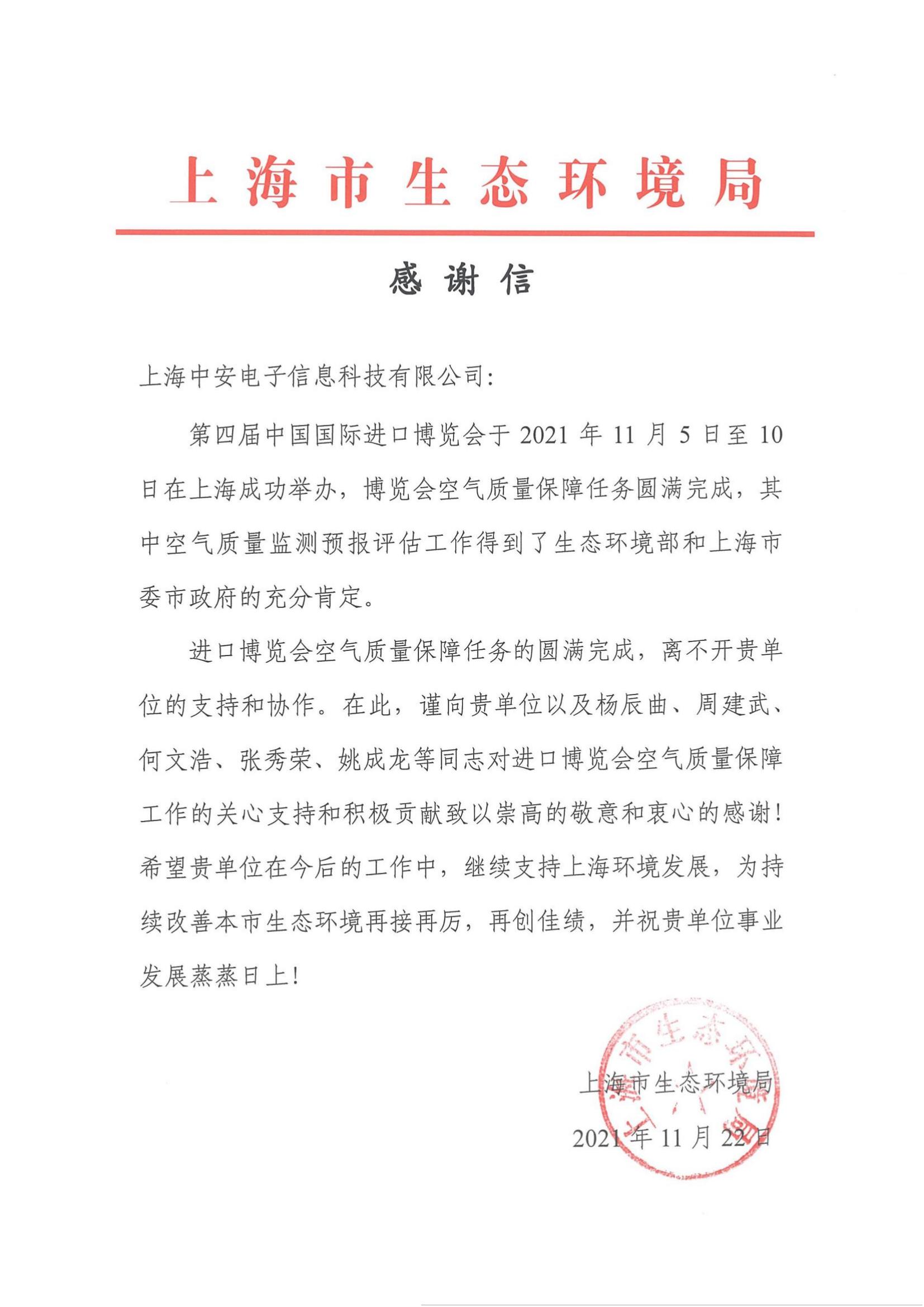 上海環(huán)監(jiān)中心就中安科技在21年國際進(jìn)博會(huì)空氣質(zhì)量監(jiān)測(cè)預(yù)報(bào)工作中杰出貢獻(xiàn)送來感謝信!(2021/12/31)